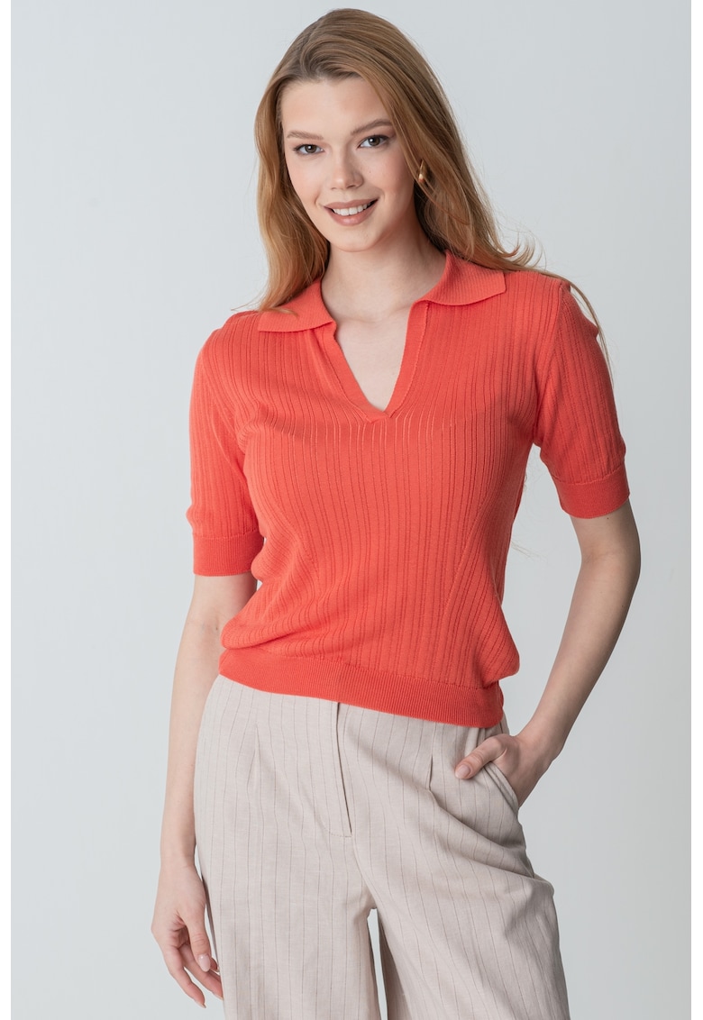 Caracteristici Culoare: portocaliu mandarina Imprimeu: uni Material: lyocell Croiala: regular fit Model: polo Lungime maneca: maneca scurta Compozitie Exterior: 100% lyocell Info model Modelul poarta un produs de marimea S. Marimi model: 176 cm inaltime