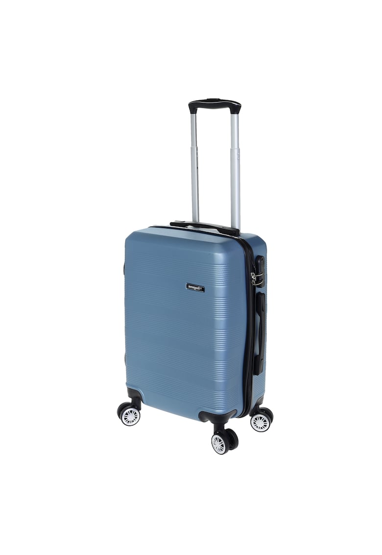 Caracteristici Culoare: albastru Material: abs Sistem inchidere: fermoar Numar roti: 4 Tip compartimente: 1 x compartiment principal Detalii: maner telescopic