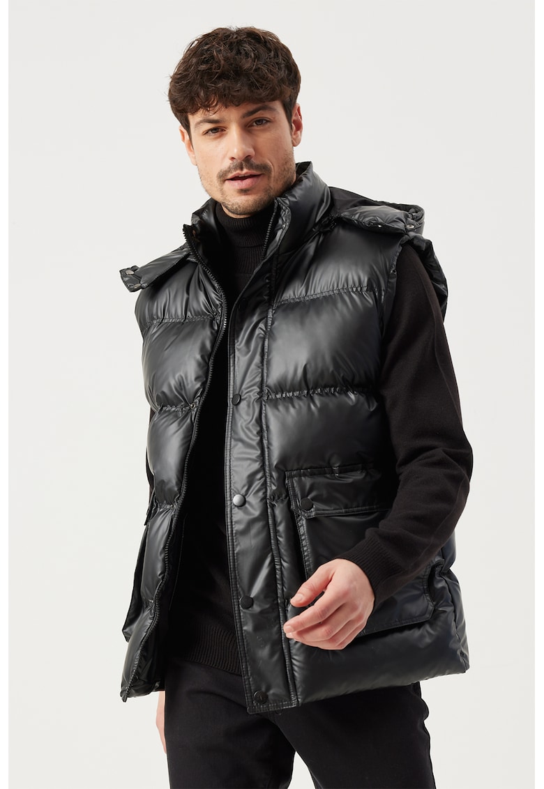 Caracteristici Tip produs: vesta Culoare: negru Material: poliuretan Croiala: regular fit Imprimeu: uni Gluga: cu gluga Buzunare: 2 exterioare