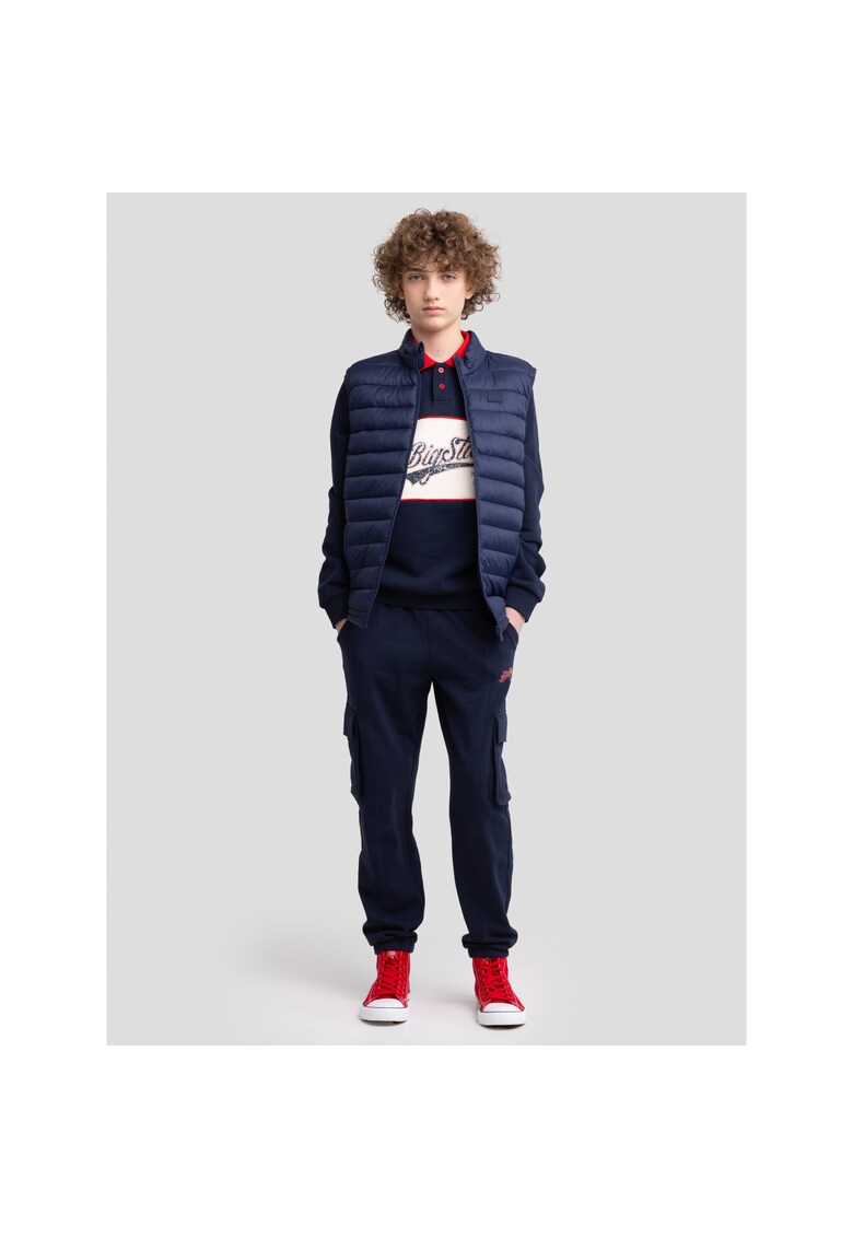Caracteristici Tip produs: vesta Culoare: bleumarin Imprimeu: uni Croiala: regular fit Material: sintetic Lungime: scurta Guler: mediu Buzunare: 2 Lungime maneca: fara maneca Detalii: aspect matlasat Sistem inchidere: fermoar Colectie: primavara