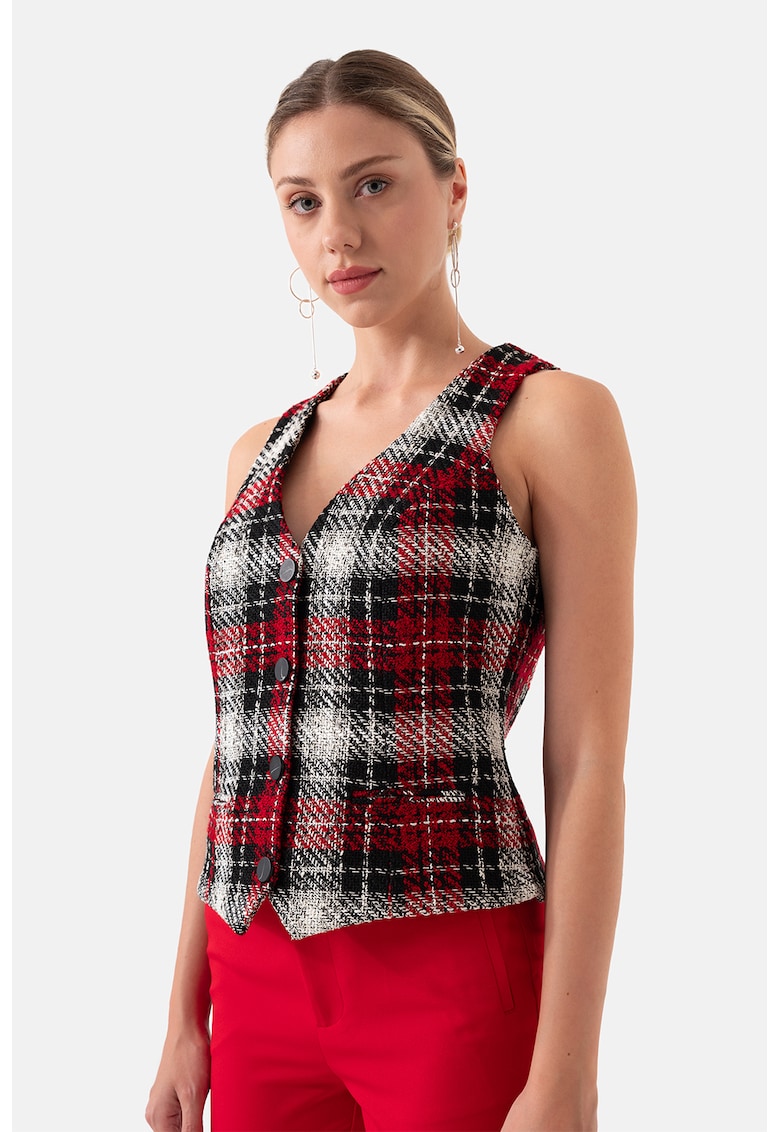 - acril Imprimeu: carouri Lungime maneca: fara maneca Sistem inchidere: nasturi Compozitie Exterior: 39% acril