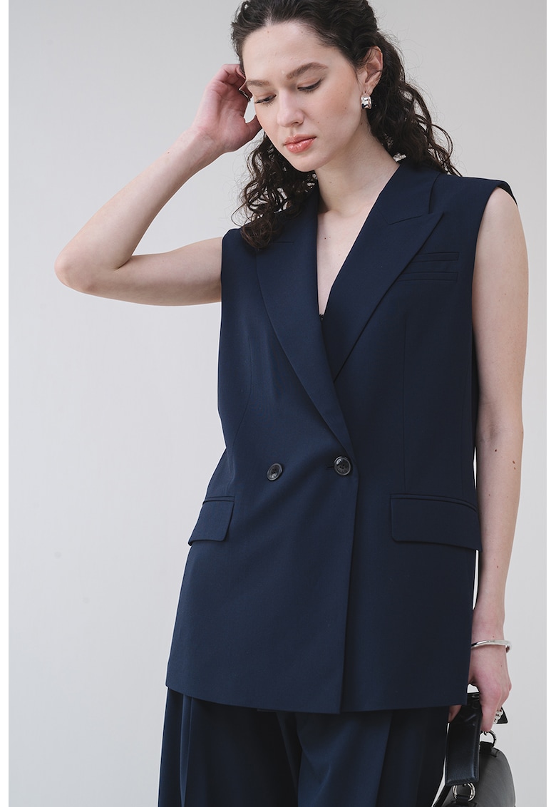 - viscoza Imprimeu: uni Guler: cu revere Lungime maneca: fara maneca Buzunare: clape Detalii: doua randuri de nasturi Sistem inchidere: nasturi Compozitie Exterior: 48% viscoza
