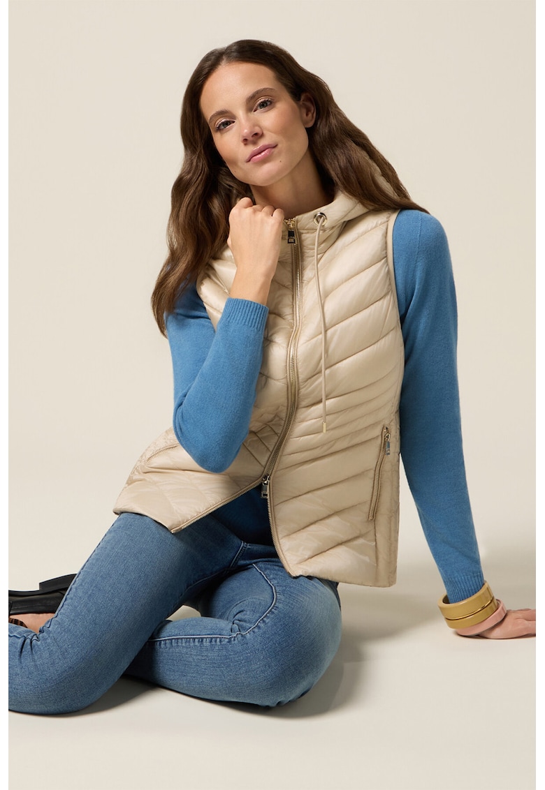 Caracteristici Tip produs: vesta Culoare: crem Imprimeu: uni Material: poliamida Croiala: regular fit Gluga: cu gluga Lungime maneca: fara maneca Sistem inchidere: fermoar Compozitie Exterior: 100% poliamida Captuseala: 100% poliamida Umplutura: 100% poliester