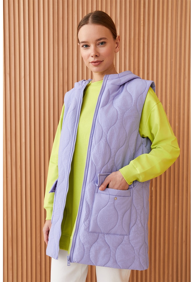 Caracteristici Tip produs: vesta Culoare: albastru lavanda Imprimeu: uni Material: poliamida Croiala: regular fit Gluga: cu gluga Lungime maneca: fara maneca Buzunare: 2 cu clapa Detalii: aspect matlasat Sistem inchidere: fermoar Compozitie Exterior: 100% poliamida Captuseala: 100% poliester Umplutura: 100% poliester