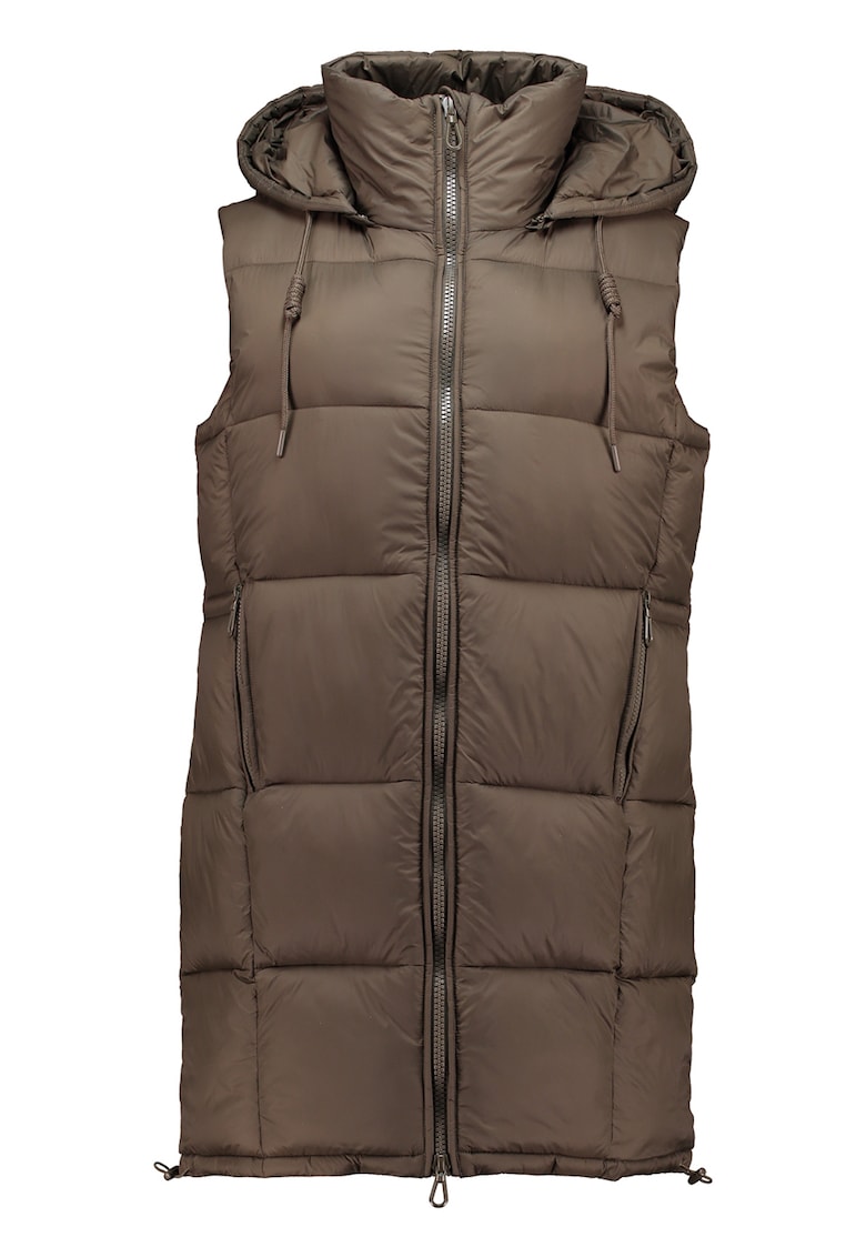 Caracteristici Tip produs: vesta Culoare: maro fango Imprimeu: uni Material: poliamida Croiala: regular fit Guler: inalt Gluga: cu gluga Lungime maneca: fara maneca Buzunare: laterale Detalii: vatelina Sistem inchidere: fermoar Compozitie Exterior: 100% poliamida