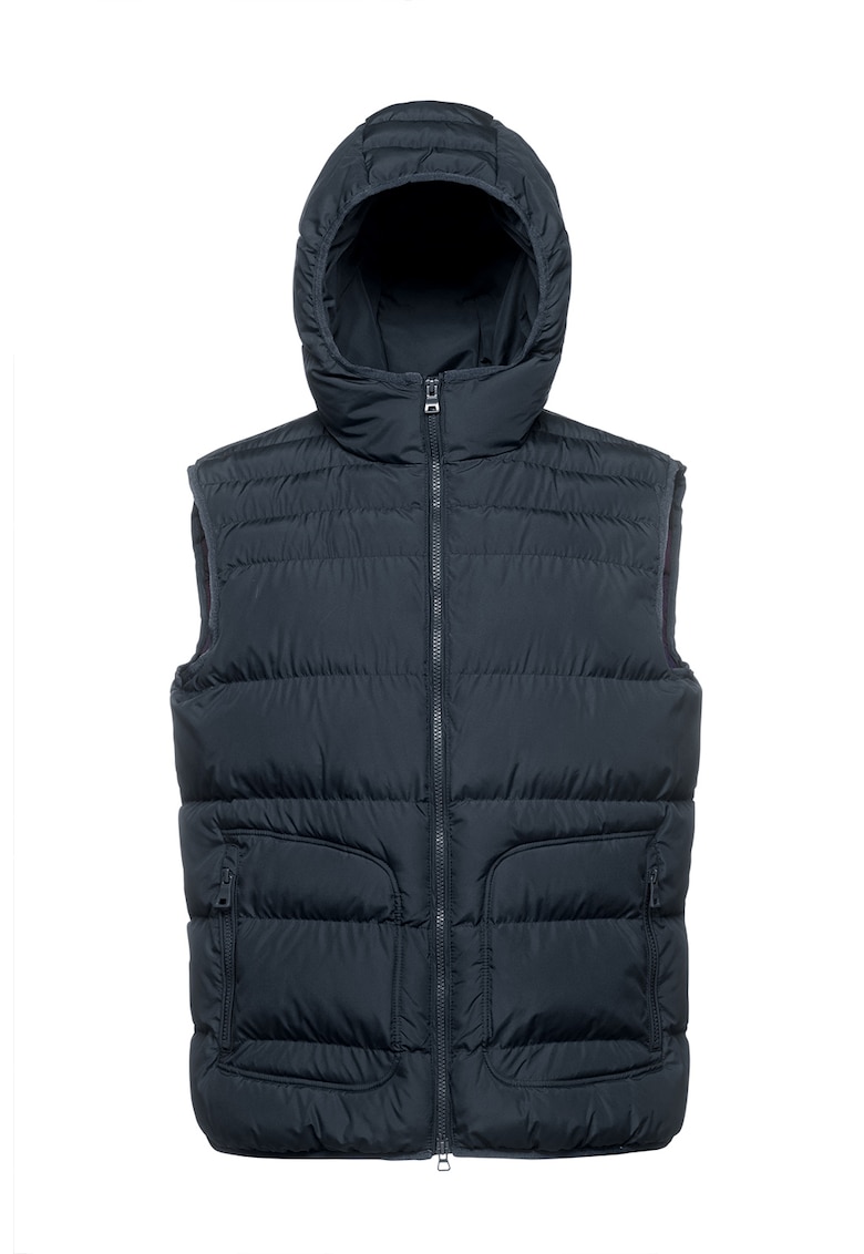 Caracteristici Tip produs: vesta Culoare: albastru ultramarin Material: poliester Croiala: regular fit Imprimeu: uni Gluga: cu gluga Guler: mediu Lungime maneca: fara maneca Buzunare: 2 cu fermoar Detalii: aspect matlasat Tehnologie: impermeabila