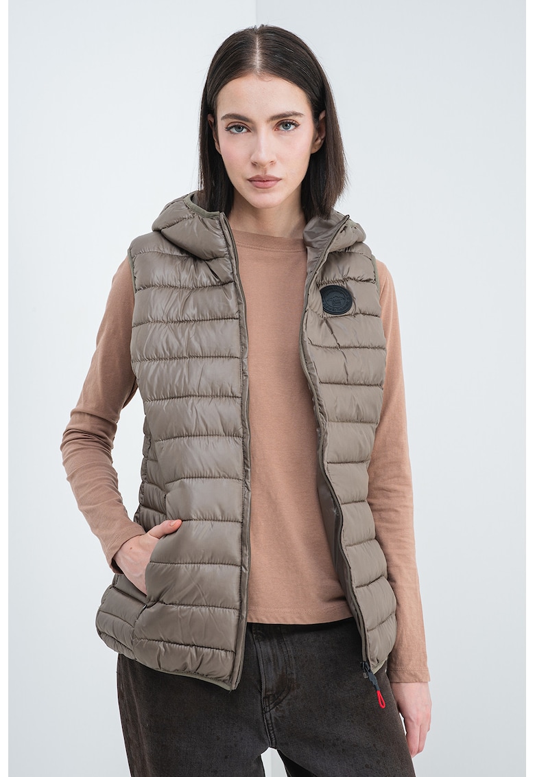 Caracteristici Tip produs: vesta Culoare: verde padure Imprimeu: uni Material: poliester Croiala: regular fit Gluga: cu gluga Lungime maneca: fara maneca Buzunare: laterale Sistem inchidere: fermoar Compozitie Exterior: 100% poliester Info model Modelul poarta un produs de marimea S. Marimi model: 174 cm inaltime