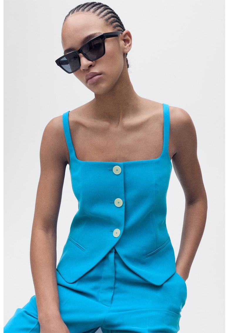 Caracteristici Culoare: albastru azur Stil: elegant Croiala: regular fit Material: sintetic Imprimeu: uni Guler: patrat Lungime maneca: fara maneca Buzunare: 2 cu refilet Sistem inchidere: nasturi Compozitie Exterior: 93% viscoza