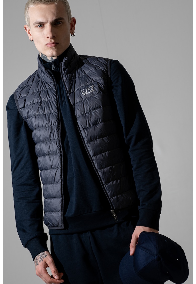 Caracteristici Tip produs: vesta Culoare: albastru prafuit Material: poliamida Imprimeu: logo Gluga: fara gluga Lungime maneca: fara maneca Sistem inchidere: fermoar Compozitie Exterior: 100% poliamida Umplutura: puf Info model Modelul poarta un produs de marimea M. Marimi model: 188 cm inaltime