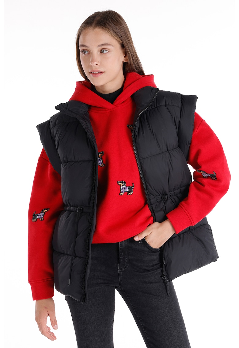 Caracteristici Tip produs: vesta Culoare: negru Imprimeu: uni Material: poliamida Croiala: regular fit Gluga: cu gluga Lungime maneca: fara maneca Detalii: vatelina