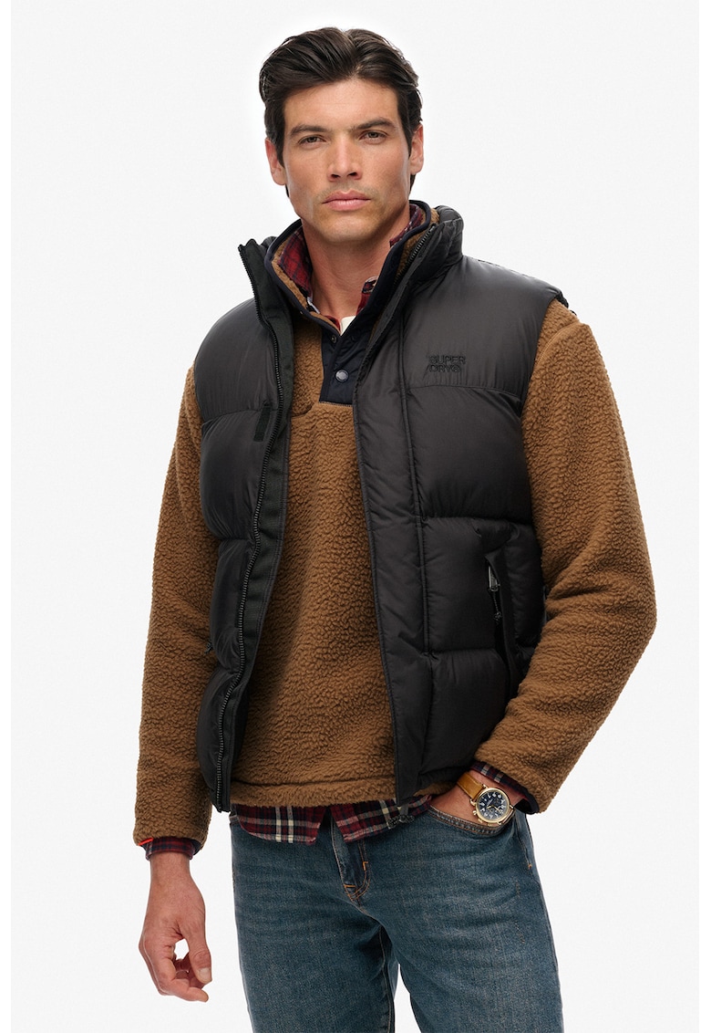 Caracteristici Tip produs: vesta Culoare: negru Material: sintetic Croiala: slim fit Imprimeu: logo Gluga: fara gluga Guler: inalt Lungime maneca: fara maneca Buzunare: 2 buzunare cu fermoar Tehnologie: impermeabila Sistem inchidere: fermoar