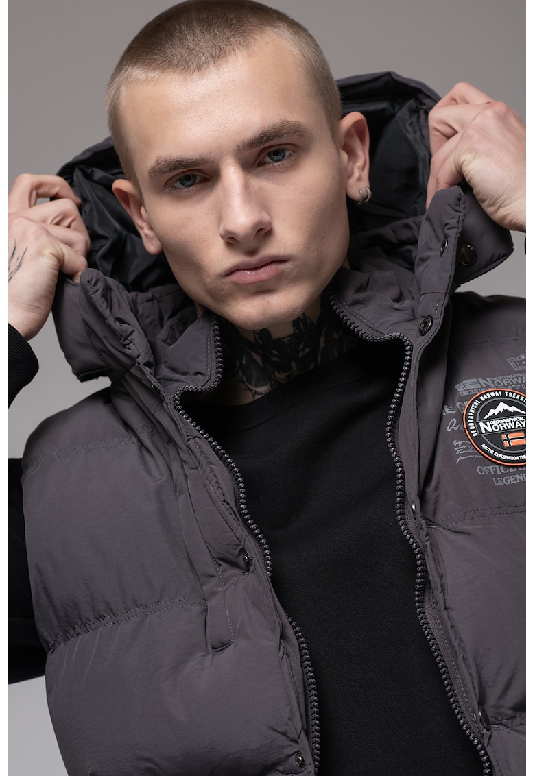 Caracteristici Tip produs: vesta Culoare: gri antracit Material: poliester Croiala: regular fit Imprimeu: logo Gluga: cu gluga Guler: inalt Lungime maneca: fara maneca Buzunare: 3 exterioare