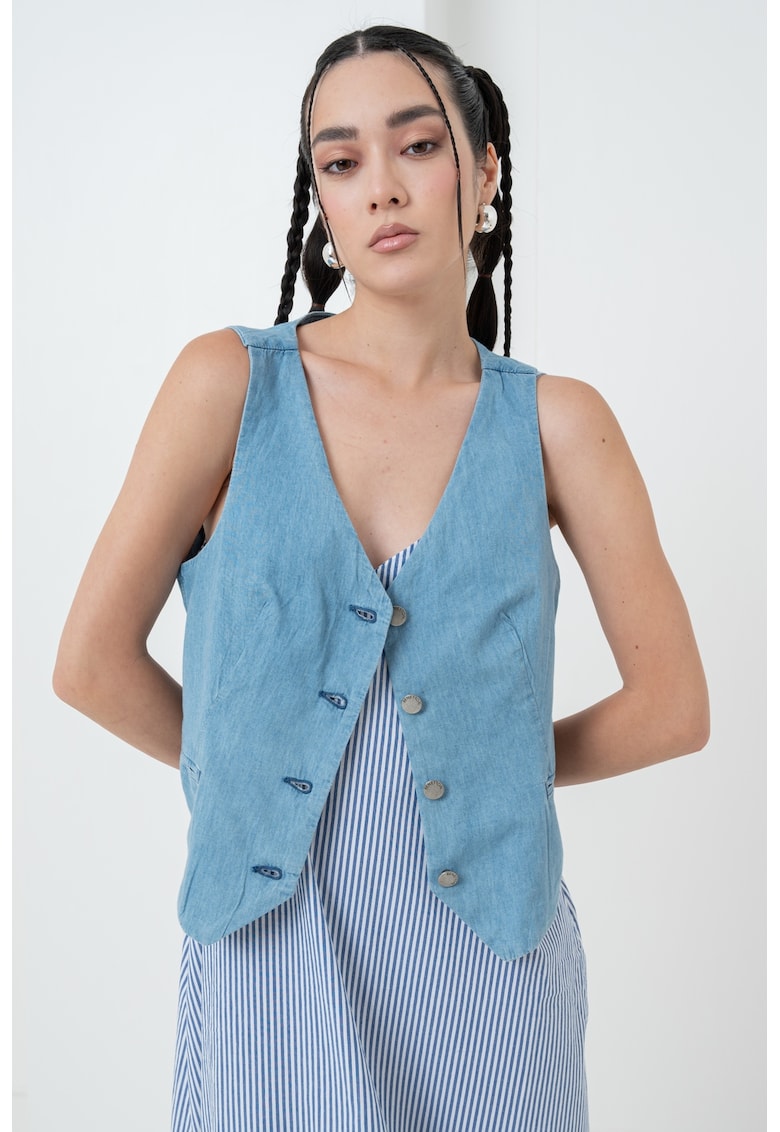 Caracteristici Tip produs: vesta Culoare: albastru pastel Imprimeu: uni Material: bumbac Croiala: regular fit Gluga: fara gluga Lungime maneca: fara maneca Sistem inchidere: nasturi Compozitie Exterior: 100% bumbac Captuseala: 100% bumbac Info model Modelul poarta un produs de marimea S. Marimi model: 170 cm inaltime