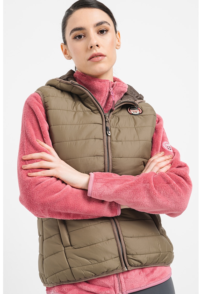 Caracteristici Tip produs: vesta Culoare: kaki Imprimeu: logo Material: nylon Croiala: regular fit Gluga: cu gluga Lungime maneca: fara maneca Buzunare: cu fermoar Sistem inchidere: fermoar Compozitie Exterior: 100% poliamida Captuseala: 100% poliamida Umplutura: 100% poliester Info model Modelul poarta un produs de marimea S. Marimi model: 177 cm inaltime