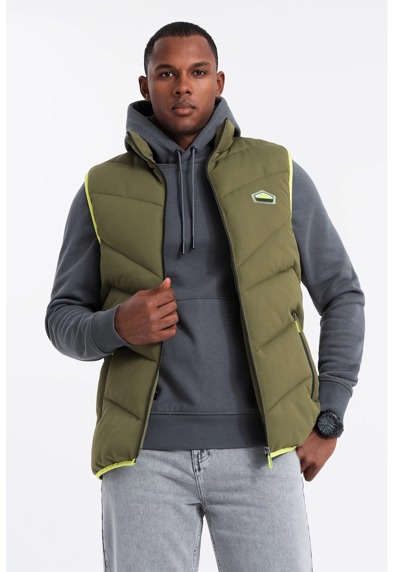 Caracteristici Tip produs: vesta Culoare: verde masliniu Material: sintetic Croiala: regular fit Imprimeu: uni Gluga: fara gluga Guler: inalt Lungime maneca: fara maneca Buzunare: cu fermoar Detalii: design matlasat Sistem inchidere: fermoar Compozitie Exterior: 100% poliester