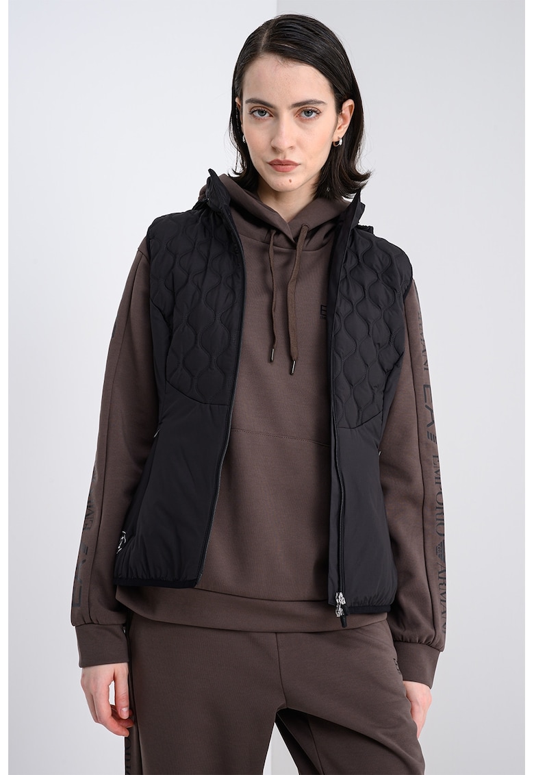 Caracteristici Tip produs: vesta Culoare: negru Imprimeu: logo Material: sintetic Croiala: slim fit Gluga: cu gluga Lungime maneca: fara maneca Buzunare: 2 buzunare cu fermoar Sistem inchidere: fermoar Compozitie Exterior: 100% poliester Captuseala: 100% poliester Umplutura: 100% poliester Info model Modelul poarta un produs de marimea S. Marimi model: 174 cm inaltime