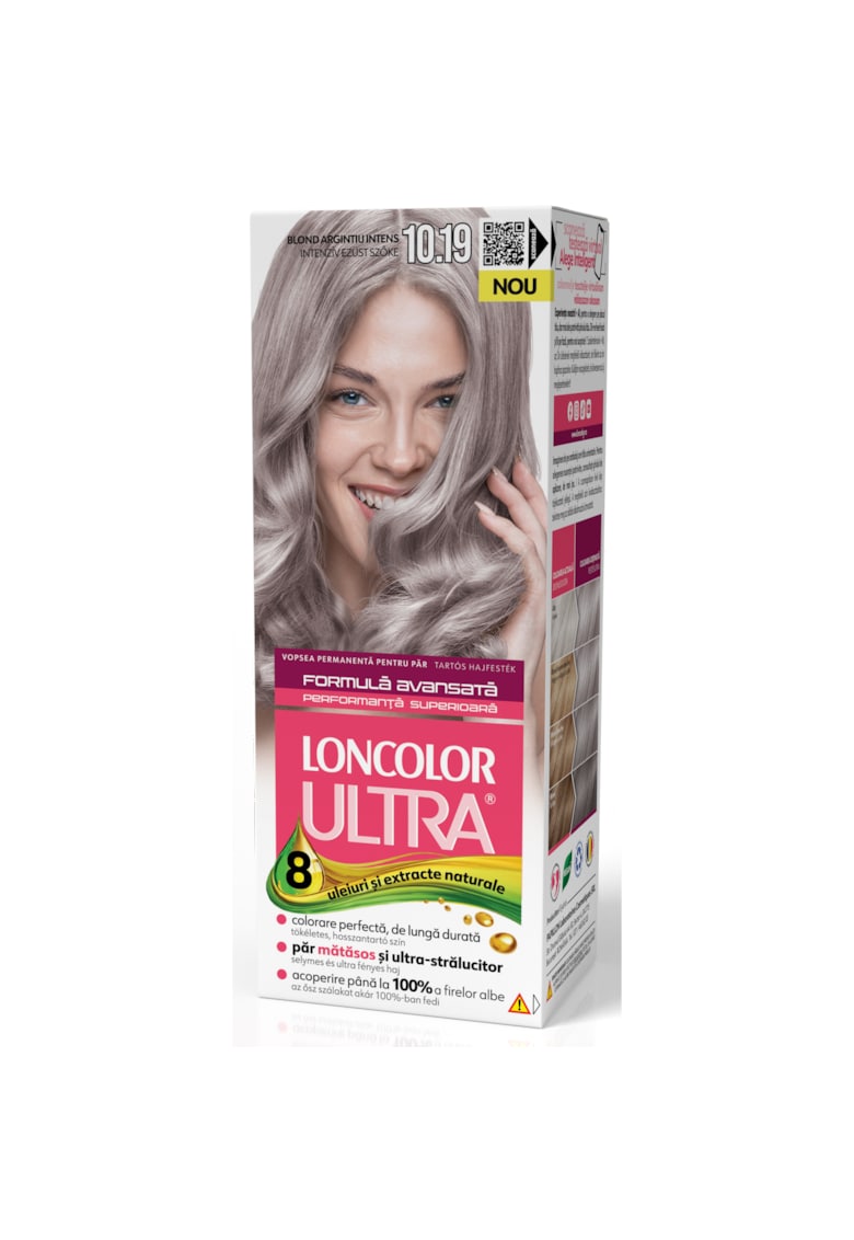 - stralucire Continut pachet: 1 x vopsea de par Cantitate: 100 ml Culoare Nuanta: blond argintiu intens Cod culoare: 10.19 Culoare: blonda