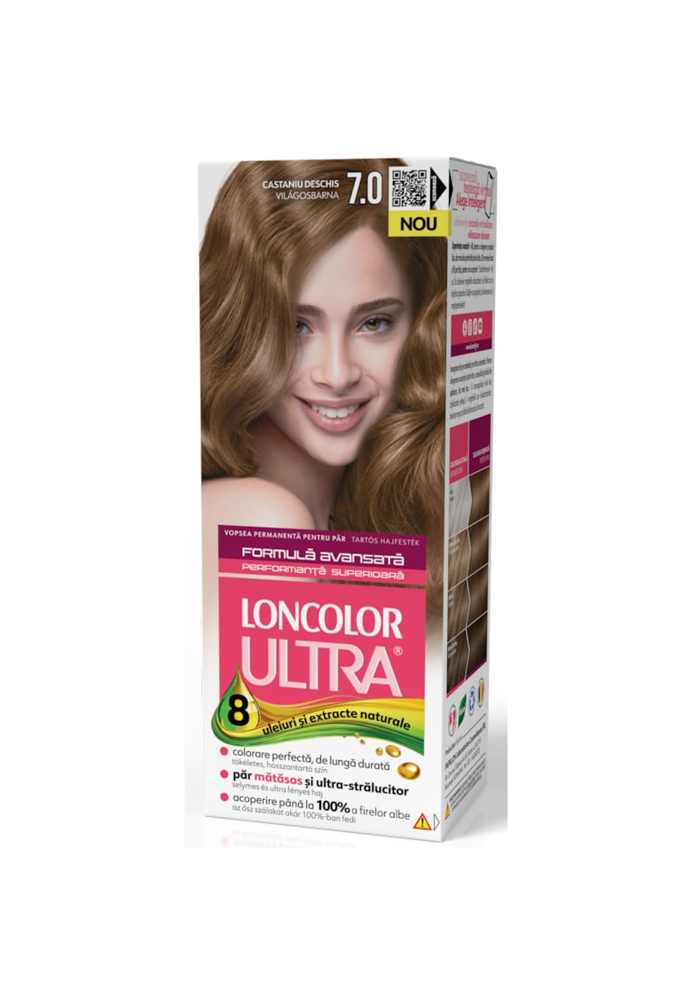 - stralucire Continut pachet: 1 x vopsea de par Cantitate: 100 ml Culoare Nuanta: castaniu deschis Cod culoare: 7.0 Culoare: castaniu