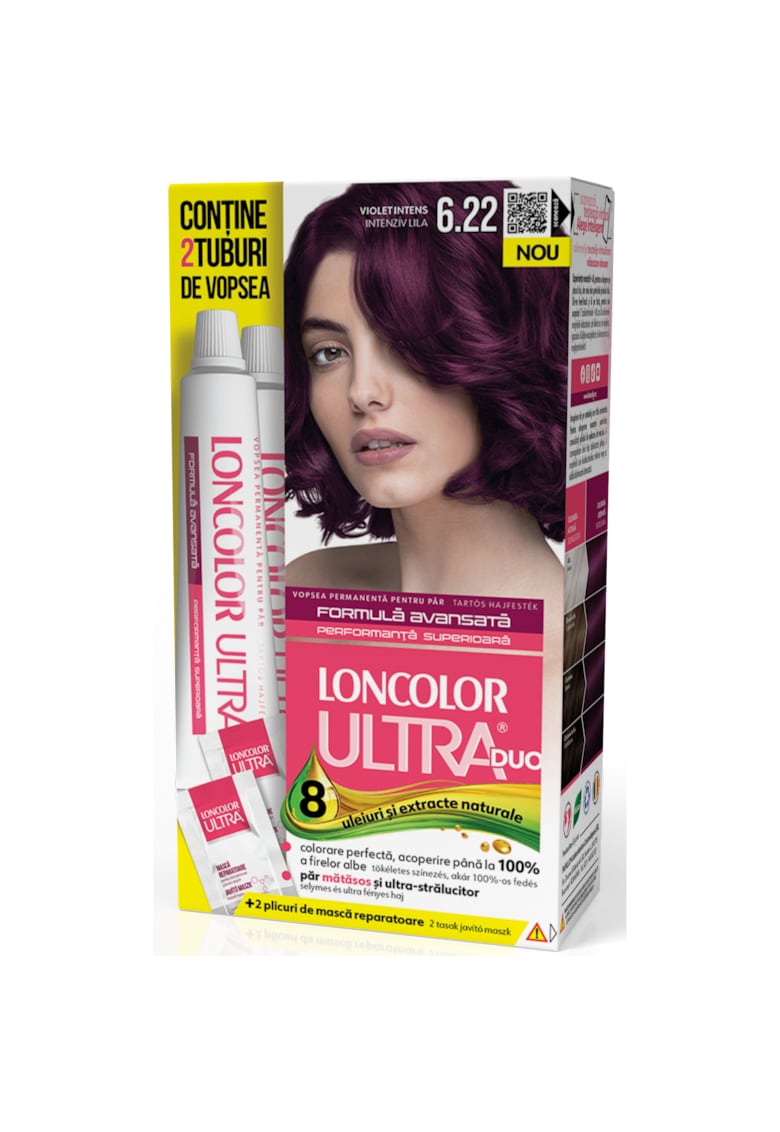 - culoare intensa Proprietati: ulei de migdale Numar bucati/set: 2 Continut pachet: 2 x vopsea de par Cantitate: 200 ml Culoare Nuanta: violet intens Cod culoare: 6.22 Culoare: violet