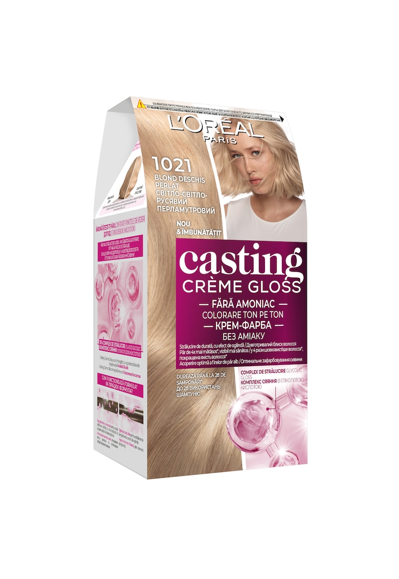 Caracteristici generale Zona corporala: par Tip: clasic Tip produs: vopsea de par Set: nu Rezistenta: semi-permanenta Componenta: fara amoniac Forma/Textura: crema Tip par: normal Gama: casting crème gloss Beneficii: stralucire Numar bucati/set: 1 Continut pachet: 1 x vopsea de par Cantitate: 180 ml Culoare Nuanta: blond deschis perlat Cod culoare: 10.21 Culoare: blonda